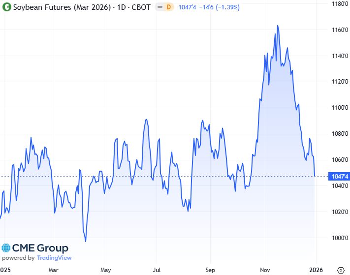 Vendredi 2 janvier 2026-3,00 €/t en fèves de soja et -2,00 €/t en farine de soja. Ellen, Fabrice et Michelvous souhaitent, à vous et vos proches,une bonne santé et le meilleur pour 2026.L'euro débute la journée sur le niveau de 1,1733 $. En cette journée de transition, nous vous proposons quelques graphiques. | Le produit à la UneAvoine blanche (30/12/2025) : Avoine est une plante annuelle de la famille des graminées NewsletterVendredi 2 janvier 2026 (02/01/2026) : -3,00 €/t en fèves de soja et -2,00 €/t en farine de soja. Mercredi 31 décembre 2025 (31/12/2025) : Inchangé en fèves de soja et en farines de soja Mardi 30 décembre 2025 (30/12/2025) : -1,00 €/t en fèves de soja et -2,00 €/t en farine de soja |